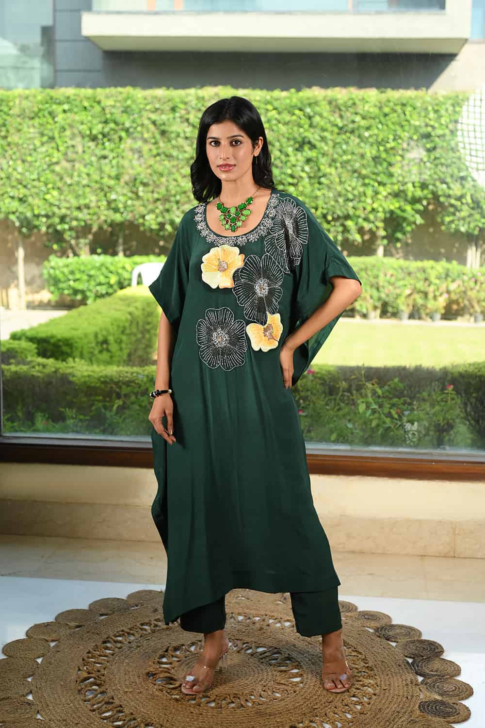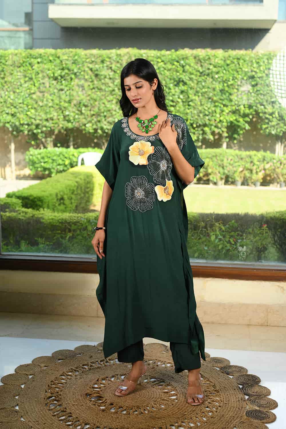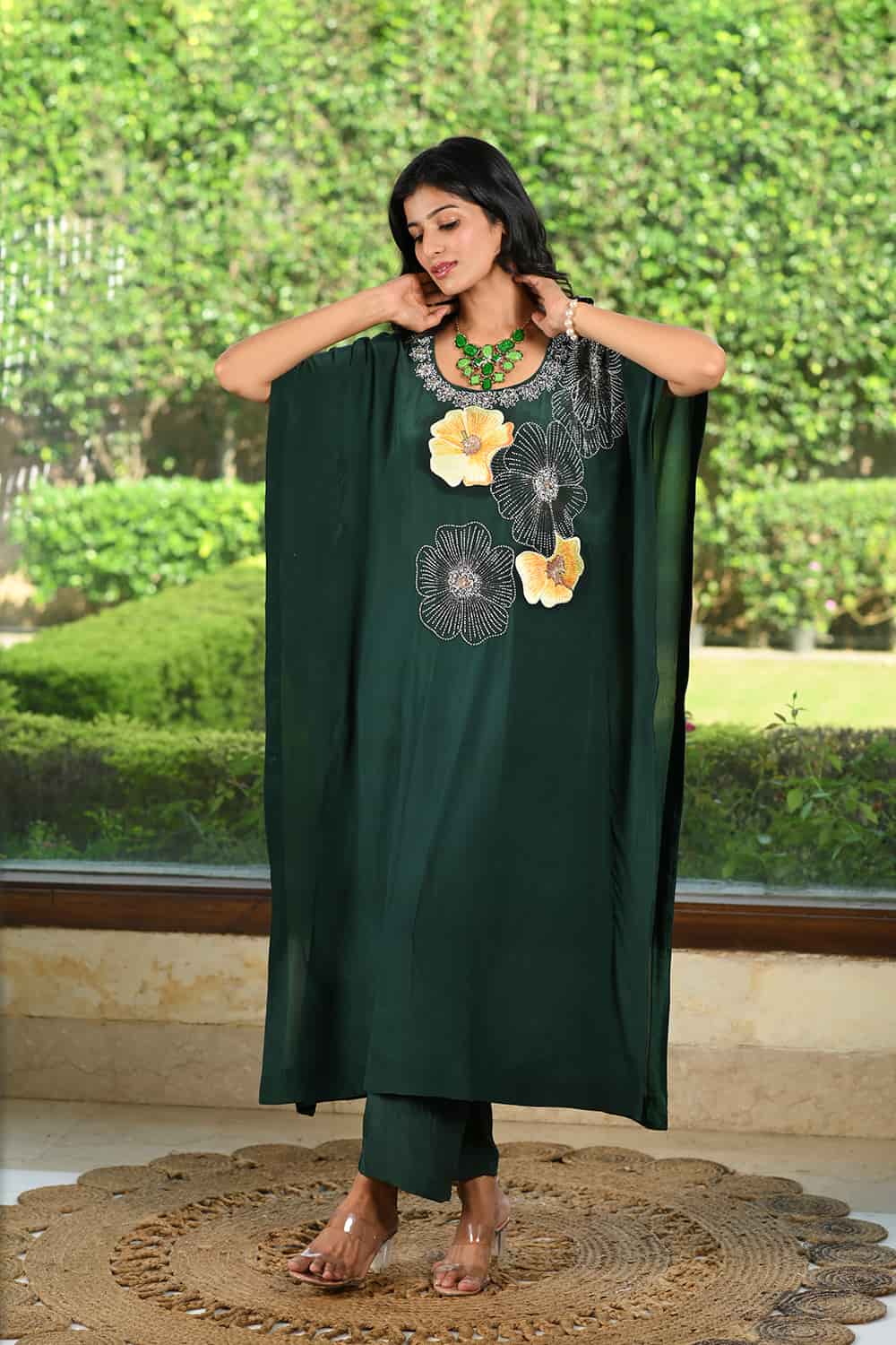 Elevate your style with our Sara Kaftan Set, crafted in pure Crape fabric. The dress is a deep forest green or dark emerald green color. It has floral embroidery in shades of white and yellow on the front. Experience effortless elegance and luxurious comfort in this stunning piece. The soft, fluid texture of Crape creates a beautiful drape, making it light, breathable, and perfect for any occasion. Get ready to shine without compromising on comfort!